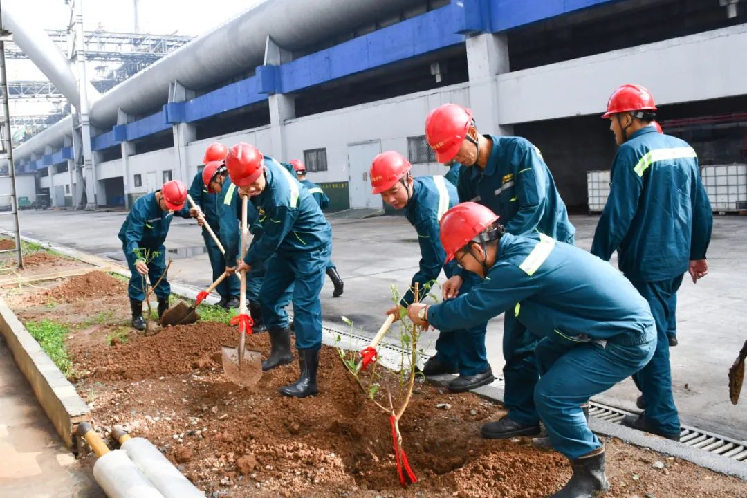 植树现场,大家分工协作、相互配合,运送树苗、挖坑栽苗、挥锹铲土、扶苗培土,干得热火朝天。经过大家的共同努力,一株株柿子、石榴、苹果等不同品种的树苗傲然屹立,错落有致,为美丽厂区增添了一道绿色风景线。