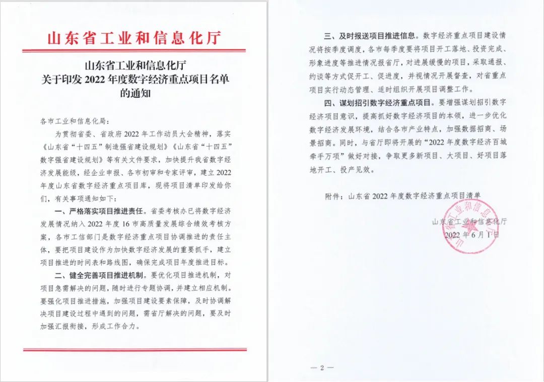 集团工业互联网平台上榜《2022年度山东省数字经济重点项目名单》
